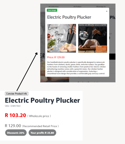 - A popup appears showing:Product TitlePriceShort DescriptionOne or Two Product ImagesA Save as Image button