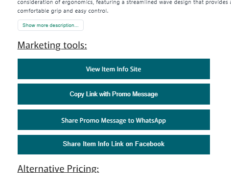 Opens Facebook with the product info link from iteminfo.co.za ready to post. Great for quick updates, flash sales, or daily product highlights.