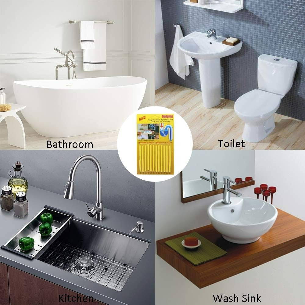 The Drain Cleaner Stick Set (12 pcs) is the simple solution to keep your home's drains clean, clear, and odor-free. Just one stick per month works powerfully to prevent nasty water build-up and eliminate embarrassing smells. This handy set is perfect for use in kitchen sinks, vanity basins, bathtubs, mop sinks, and more, helping maintain fresh and clog-free pipes without the hassle of expensive plumbing services.